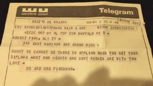 Fink’s telegram read: “Sorry we cannot be there to applaud when you get your diploma but our hearts and best wishes are with you. Love Dr. and Mrs. Fischman.”